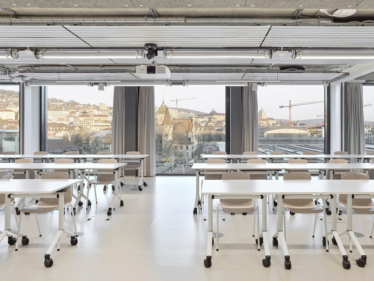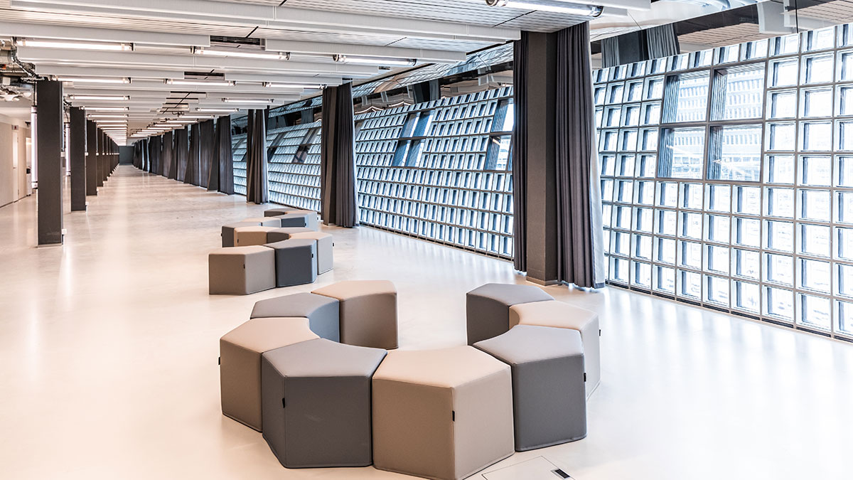 With the cantilevered facade made of glass blocks on the railway side, the building designed by the Geneva architects Made in has a unique visual presence – and interiors flooded with light.