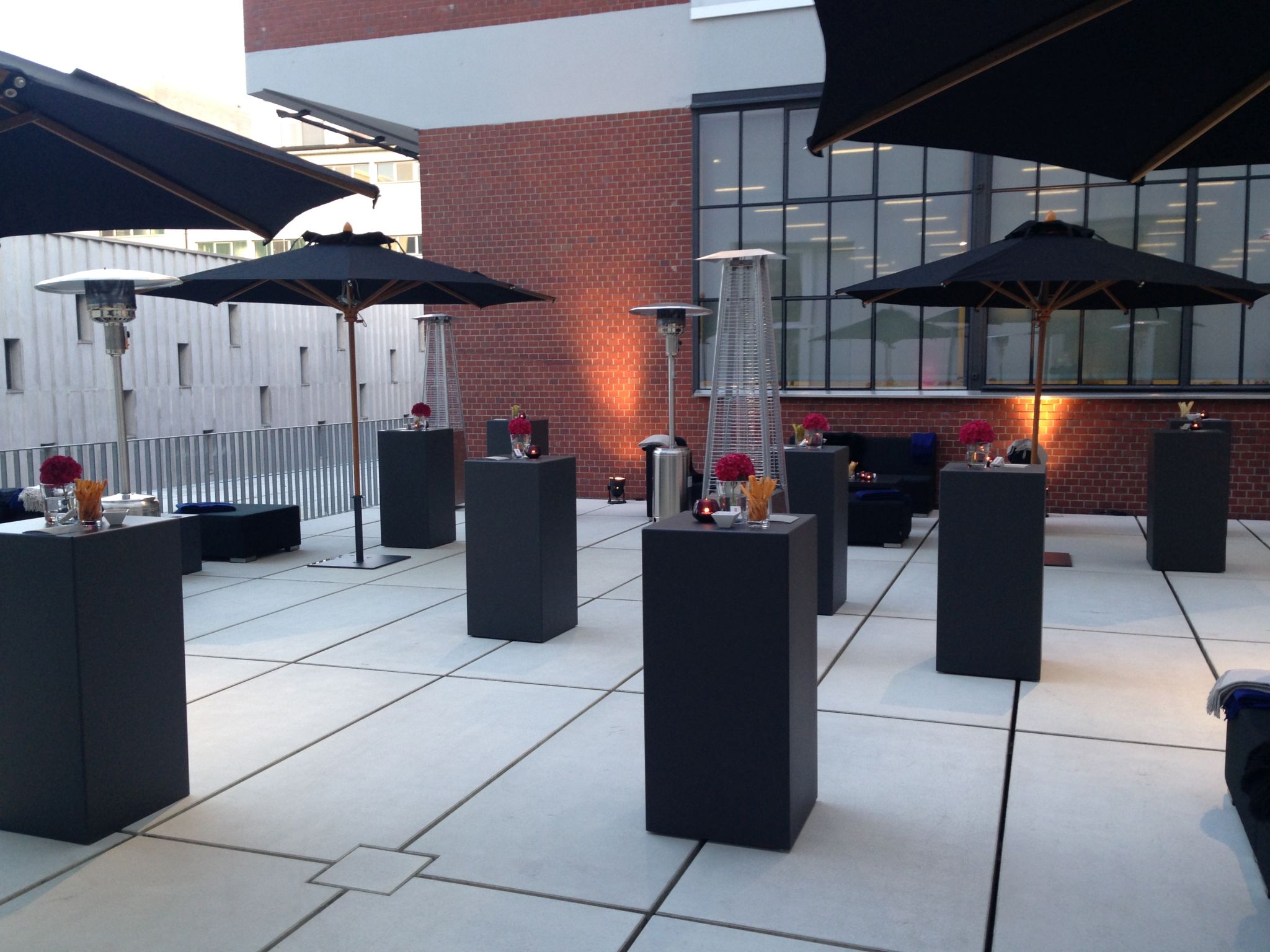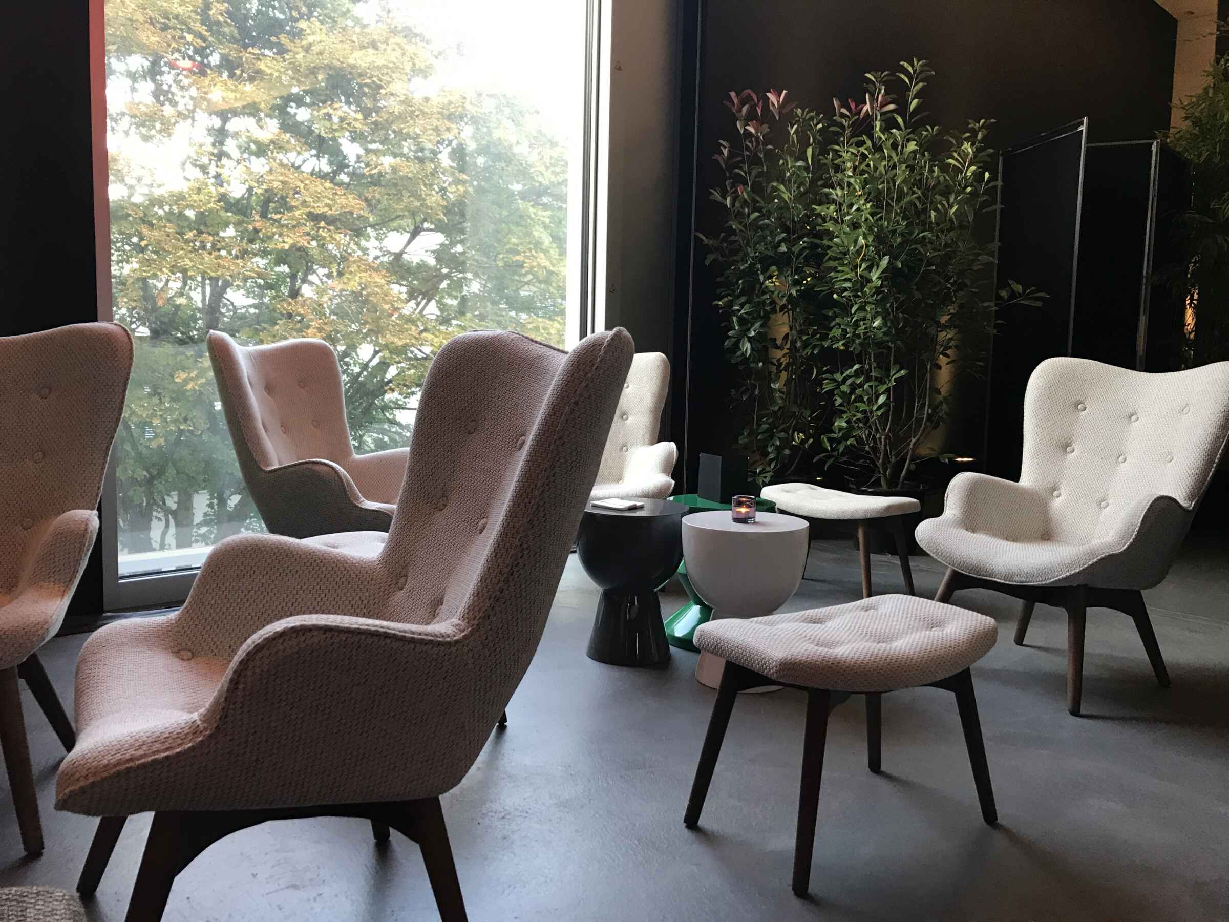 This space designed by the Austrian artist Heimo Zobernig is located in the Löwenbräukunst complex – the contemporary art center – in the heart of Zurich West. The spacious terrace with a view of the courtyard, the Swiss Mill Tower and the old factory chimney makes the industrial area immediately experienceable.