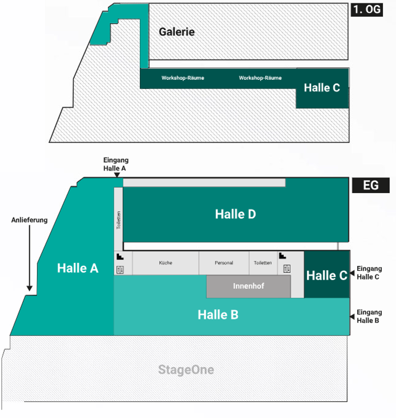 Die Haupthallen A und B sind aneinander gelegt und können zu diversen Raumgestaltungen eingerichtet werden. Durch die grossen, schallschluckenden Vorhängen ist es möglich die Hallen in verschiedene Bereiche zu unterteilen, und die moderne Technik erlaubt, dass jeder Bereich individuell eingerichtet wird. Der versteckte Innenhof kreiert einen privaten Aussenbereich.