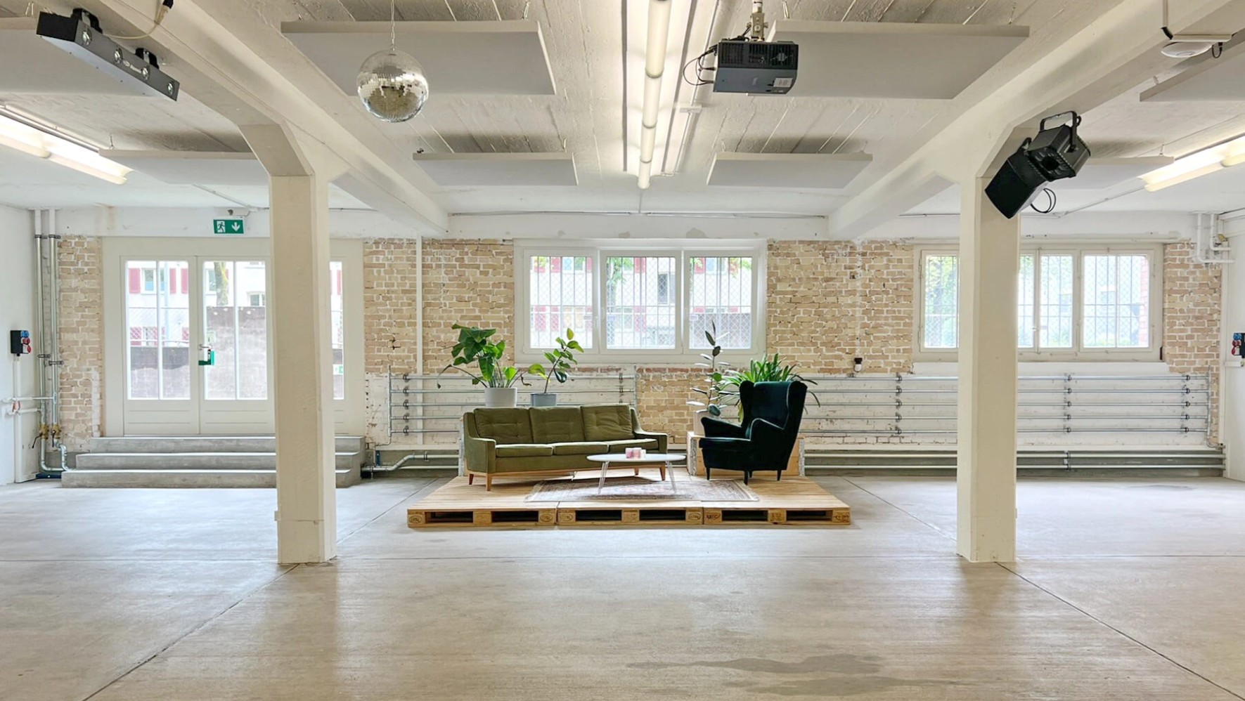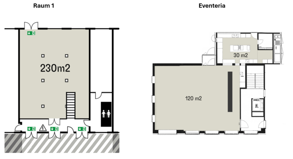 Der ‚Raum 1‘ öffnet sich hin zum Aussenhof, welcher an schönen Tagen als Aussenbereich dienen kann. Ein minimalistisch eingerichteter Raum, der die Kulisse für diverse Konzepte und Raumgestaltungen bietet. Bereits vorhanden sind eine Teeküche mit Bar, sowie Tische und Stühle für 100 Personen.