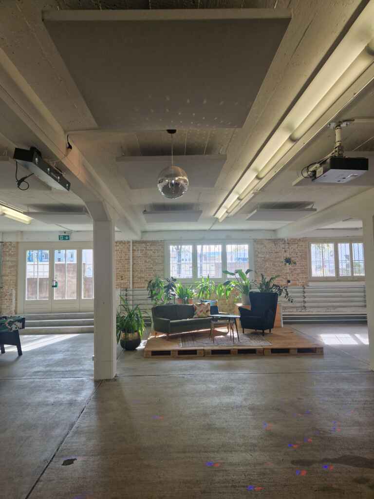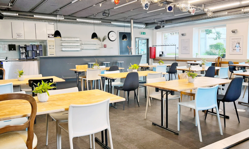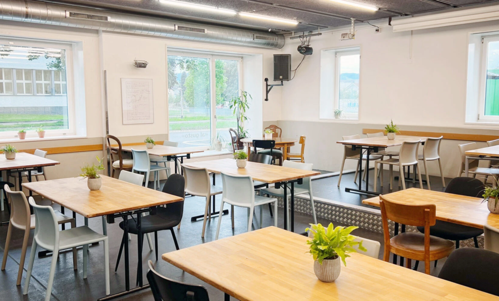 Leicht abgelegen vom Gelände befindet sich die ‚Eventeria‘ im Gebäude ‚Frjz‘. Unter der Woche dient dieser Raum tagsüber als Restaurant und Community Treffpunkt. Abends und am Wochenende kann der Raum für Events gemietet werden. Der Raum ist bereits mit Tischen und Stühlen eingerichtet und verfügt über eine kleine Bühne und eine Bar.